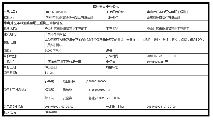 華山片區(qū)市政道路照明工程施工中標(biāo)公示