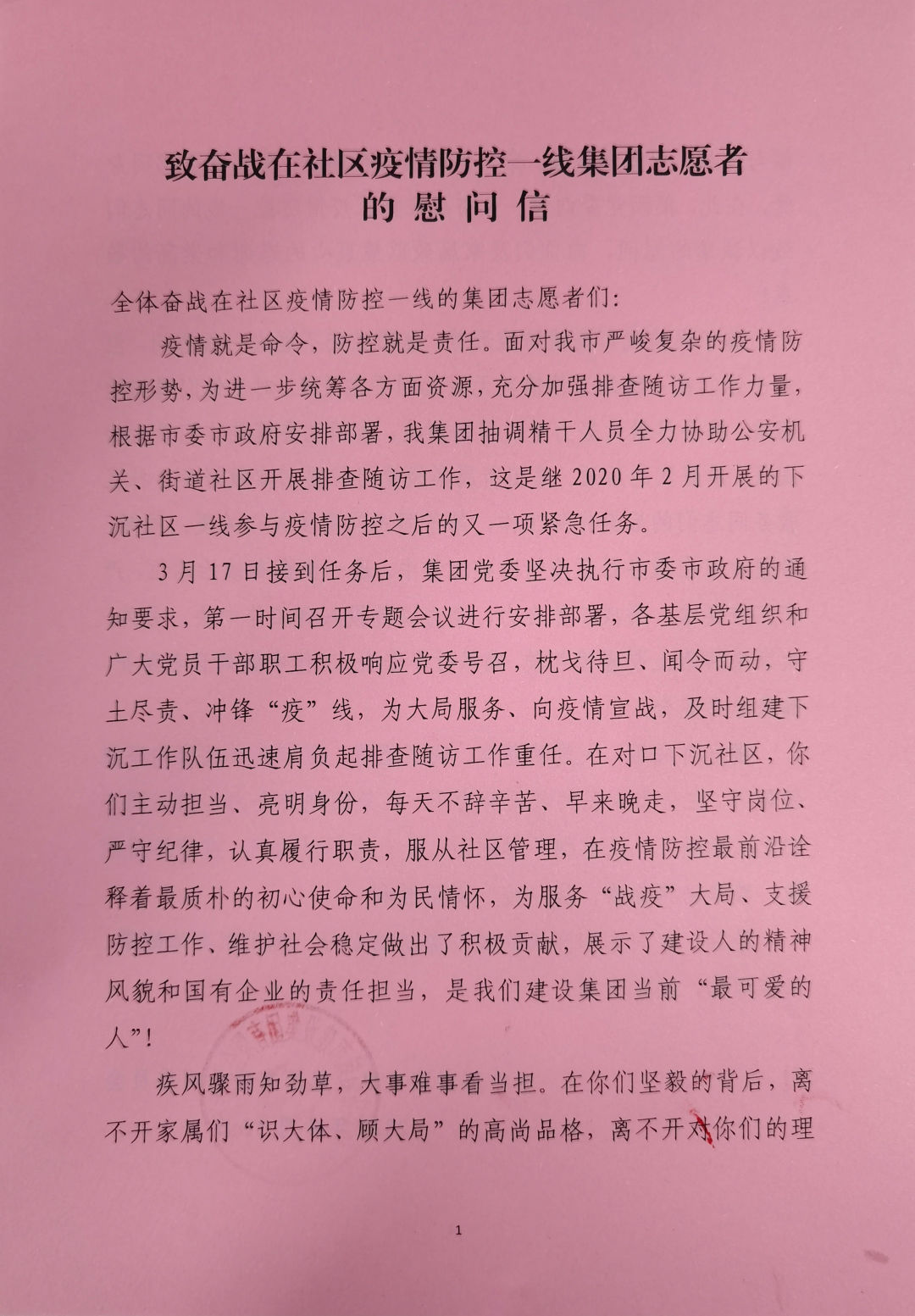 鑒于當前我市疫情防控形勢,集團黨委不能去一線慰問,但對于你們在一線的工作情況無時無刻不在關注,對于你們遇到的困難,將會盡最大努力予以幫助解決,集團黨委就是你們最大的底氣、最堅實的后盾。集團所屬各級黨組織要切實做好參與社區服務同志們的后勤保障工作,給予同志們更多關心關愛。同時,希望大家在服務社區疫情防控工作中,進一步提高政治站位,嚴守工作要求,形成工作合力,全力以赴投入到工作中去。另外,大家來回路上要謹慎駕駛,確保行車安全;工作中做好自我防護,確保自身安全。