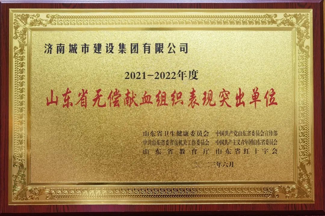 6月14日,值第二十個“世界獻(xiàn)血者日”,山東省衛(wèi)生健康委在濟(jì)南舉行山東省2023年世界獻(xiàn)血者日宣傳活動,對榮獲全國無償獻(xiàn)血表彰和全省無償獻(xiàn)血表揚的集體和個人頒發(fā)獎牌和證書,濟(jì)南城市建設(shè)集團(tuán)榮獲“山東省無償獻(xiàn)血組織表現(xiàn)突出單位”榮譽(yù)稱號。