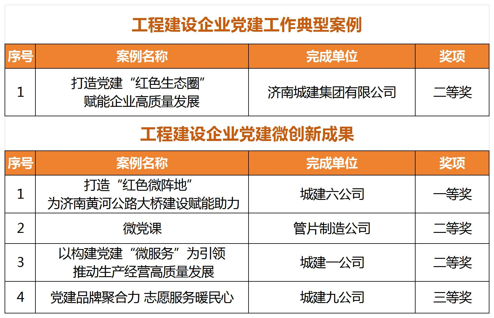 近日,中國施工企業(yè)管理協(xié)會發(fā)布了《關(guān)于推廣2024年工程建設(shè)企業(yè)黨建工作優(yōu)秀成果的通知》,建設(shè)集團(tuán)所屬濟南城建集團(tuán)公司《打造黨建“紅色生態(tài)圈” 賦能企業(yè)高質(zhì)量發(fā)展》黨建工作案例獲評“工程建設(shè)企業(yè)黨建工作典型案例”二等獎,城建六公司《打造“紅色微陣地 ” 為濟南黃河公路大橋建設(shè)賦能助力》、城建一公司《以構(gòu)建黨建“微服務(wù)”為引領(lǐng) 推動生產(chǎn)經(jīng)營高質(zhì)量發(fā)展》等4項案例分別獲評“工程建設(shè)企業(yè)黨建工作微創(chuàng)新成果”一、二、三等獎。