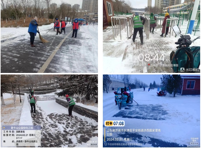 濟(jì)南城市建設(shè)集團(tuán)園區(qū)管理有限公司提前做出預(yù)判并發(fā)布相應(yīng)通知,為惡劣天氣應(yīng)急管理做好全面準(zhǔn)備。華山、濟(jì)西濕地、濟(jì)南園博園三大景區(qū)及時(shí)響應(yīng)、迅速行動(dòng),全力組織開展掃雪除冰工作,利用掃雪車、雪鍬、雪鏟等工具,對景區(qū)內(nèi)各出入口、廣場、道路臺階等重點(diǎn)部位進(jìn)行清雪、清冰工作并鋪設(shè)相應(yīng)防滑措施,保障道路暢通與市民游客安全,最大限度減少低溫雨雪天氣影響。