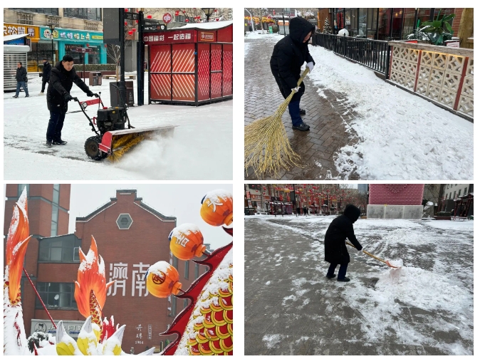 濟(jì)南泉世界商業(yè)管理有限公司召集物業(yè)團(tuán)隊(duì)提前對印象濟(jì)南·泉世界進(jìn)行緊急除雪應(yīng)對部署。根據(jù)特殊天氣情況在商戶群內(nèi)提前下發(fā)溫馨提示,提醒商家大雪天氣地面濕滑、注意出行安全,同時(shí)做好相關(guān)保障措施。公司督導(dǎo)物業(yè)公司提前對除雪設(shè)施設(shè)備進(jìn)行保養(yǎng),備好除雪物資。街區(qū)從凌晨開始對商戶門前、主干道及街區(qū)內(nèi)外部道路進(jìn)行清掃工作,借助掃雪機(jī)對主干道進(jìn)行大清工作,為商戶及游客開辟出暢通安全的道路。