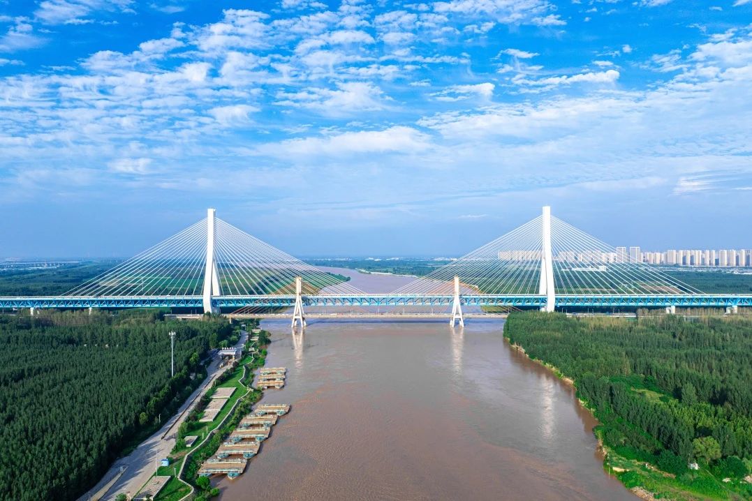 其中主橋長(zhǎng)1028米,與老橋并行布置,新老橋中心間距33.5米,橋面凈距5-7米,面高差24米,是黃河流域跨徑最大、鋼橋總長(zhǎng)最長(zhǎng)的公軌分層合建橋梁。