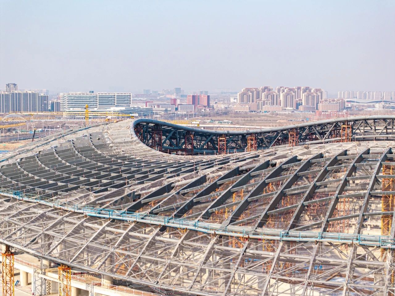 項目總用鋼量約3.5萬噸,鋼結構施工擁有多項國內之最,屋蓋鋼結構最大懸挑長45米,是國內體育場館懸挑長度之最;施工跨越夏秋冬三季,溫度變化會形成巨大誤差,累積合龍段施工難度為目前國內之最;鋼結構拼裝完成后,支撐胎架進行分級卸載,卸載過程中產生的變形量是國內同類場館之最。